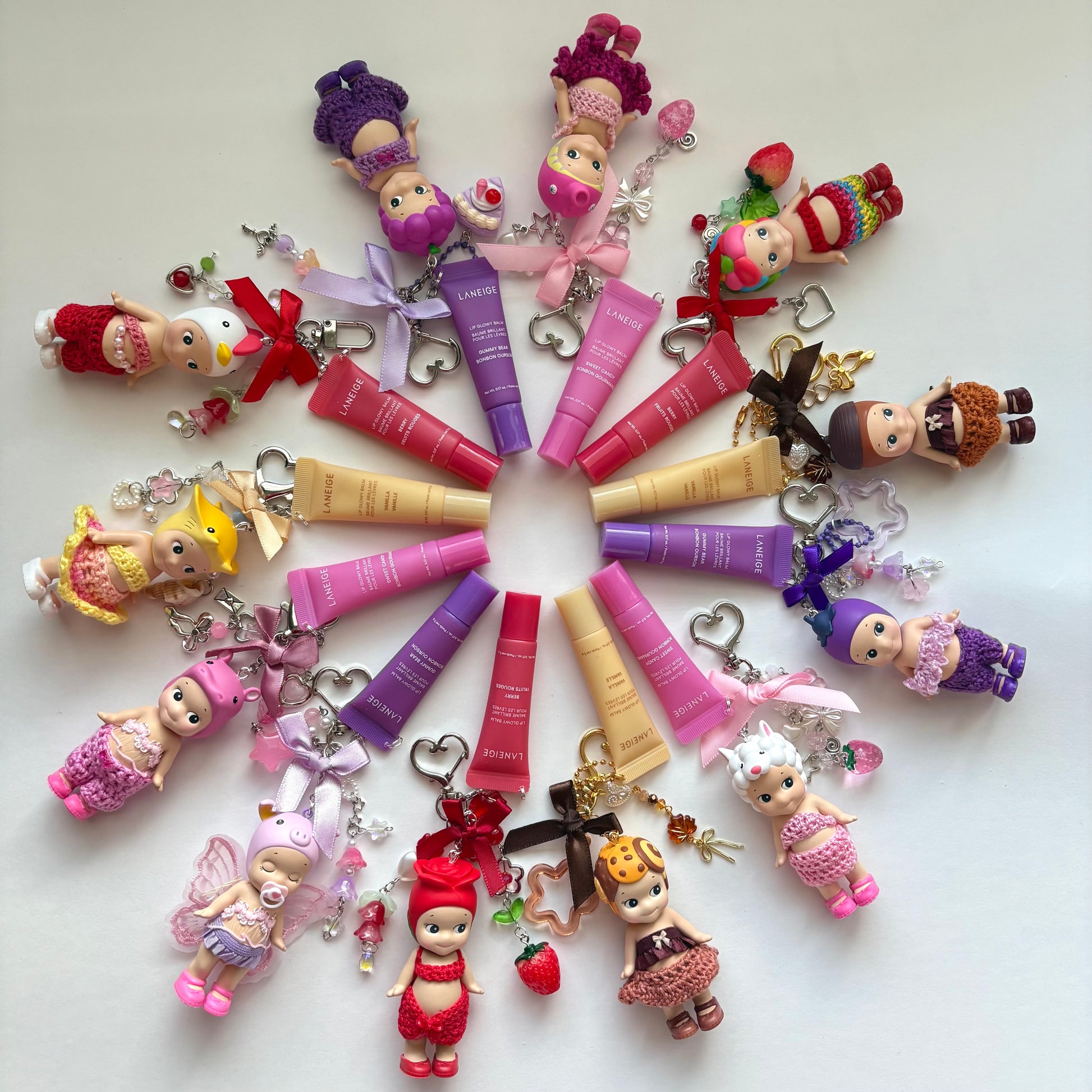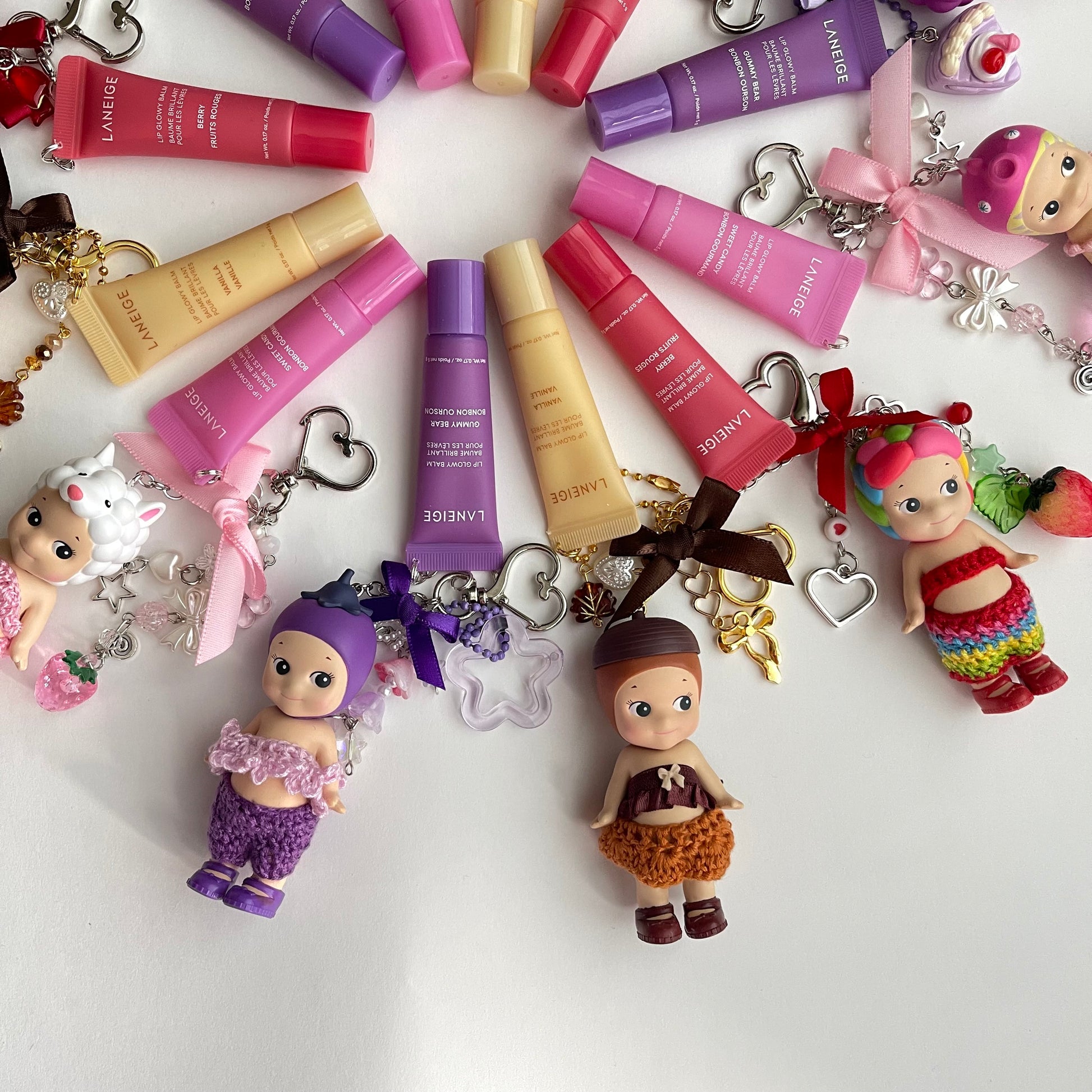 sonny angel keychains x crochet outfits and mini laneige lip balms
